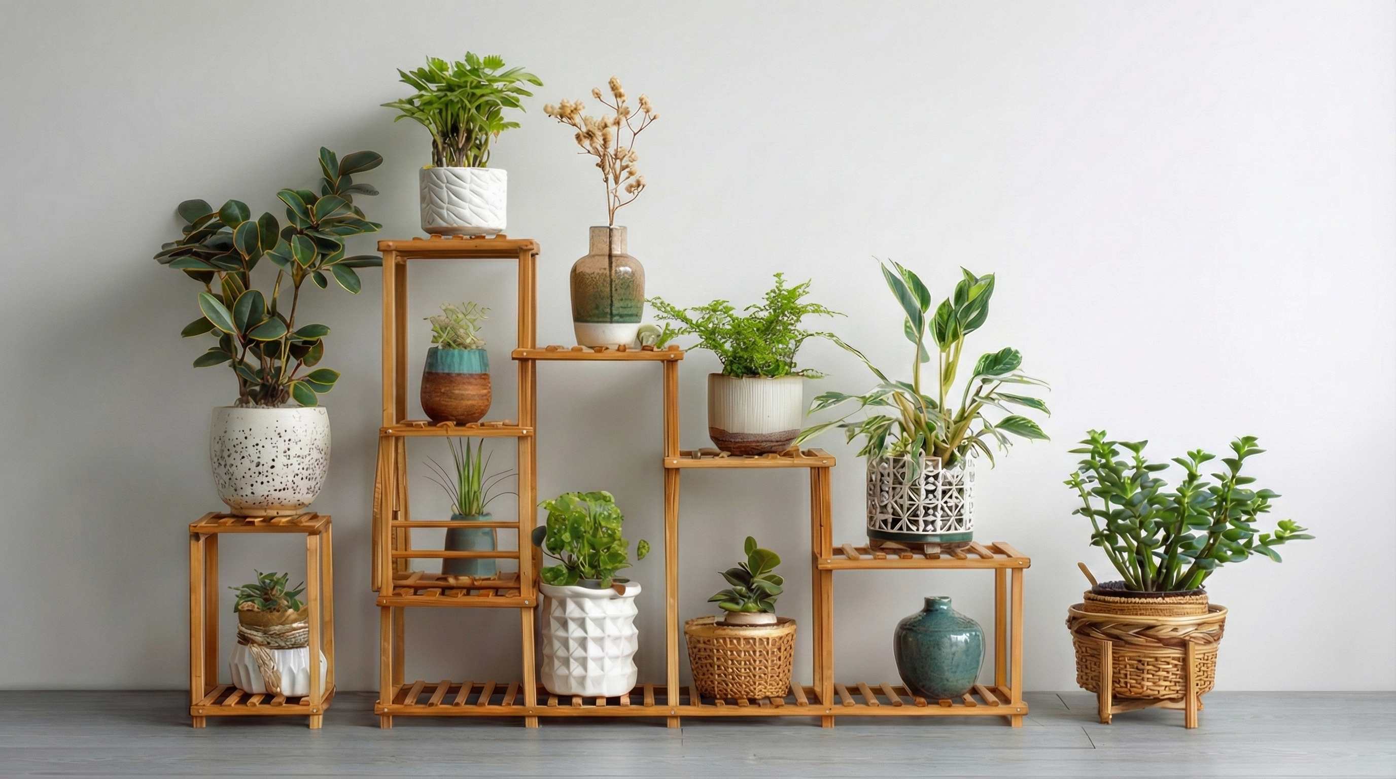 Modern Cylinder Planter Pots with Drainage & Wooden Stand – Durable ABS Plastic with Seamless Saucers – Ideal for Indoor & Outdoor Plant Styling – Pack of 2