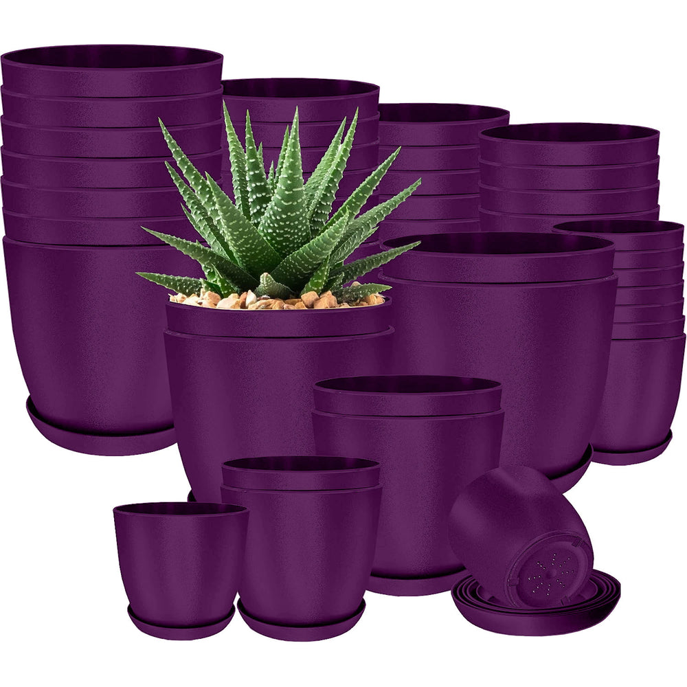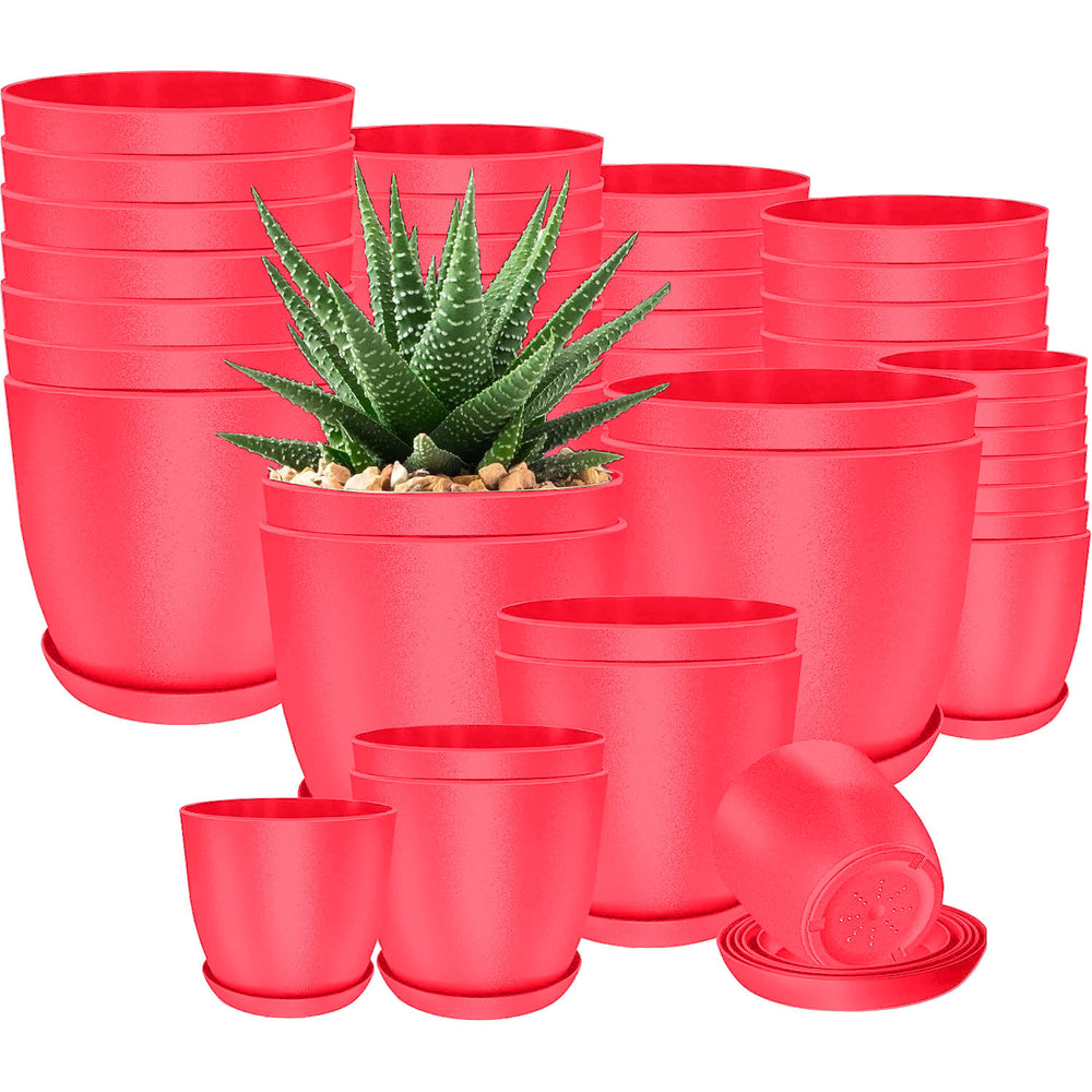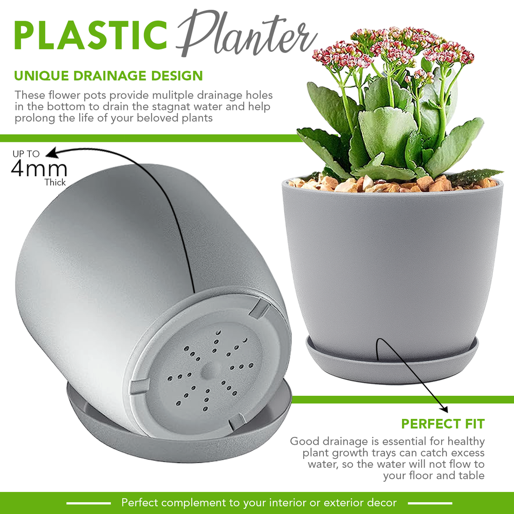 - Assorted Sizes with Matching Saucers: Includes five different sizes to suit any plant's needs: Extra-large (7” W x 5.9” H), Large (6.6” W x 5.4” H), Medium (6” W x 5” H), Small (5.3” W x 4.4” H), and Extra Small (4.8” W x 4” H), each with a matching saucer for proper drainage.